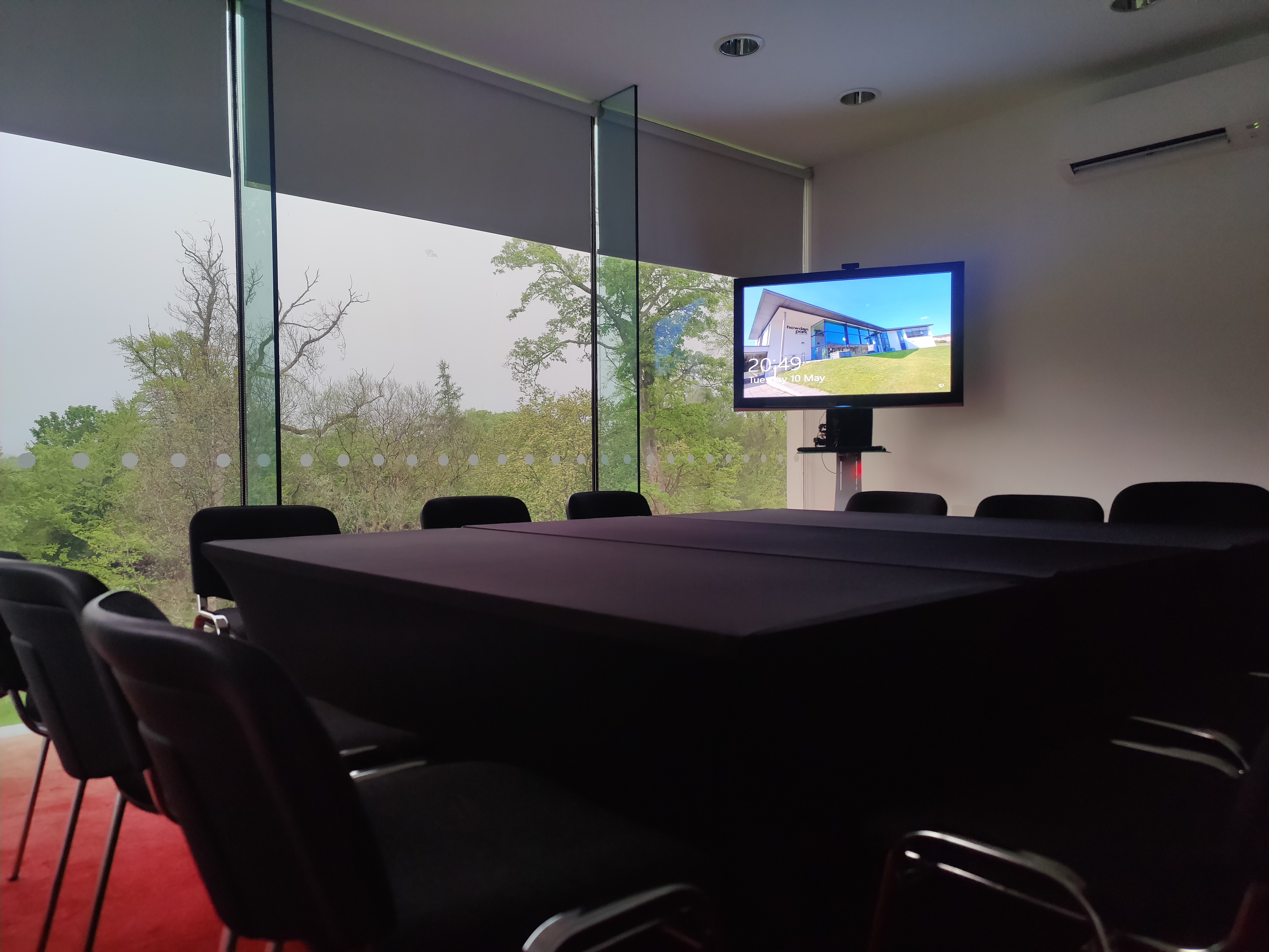 Our fully accessible first-floor board room for up to 20 people with floor to ceiling views over the parkland over to the Pentlands.